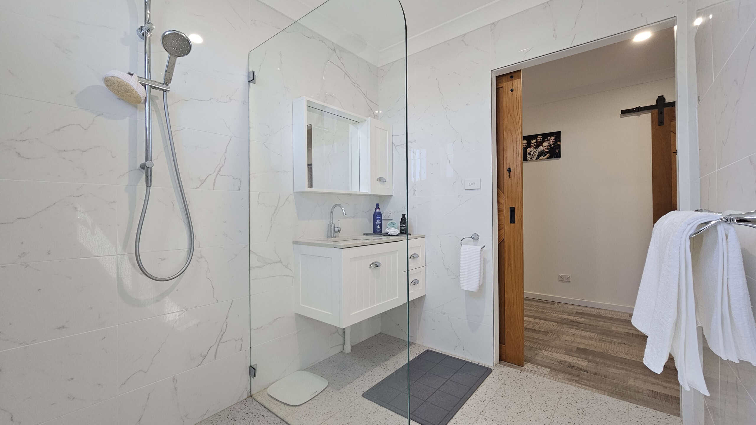 Bathrooms: Ceiling to floor tile finishes for easy-care.