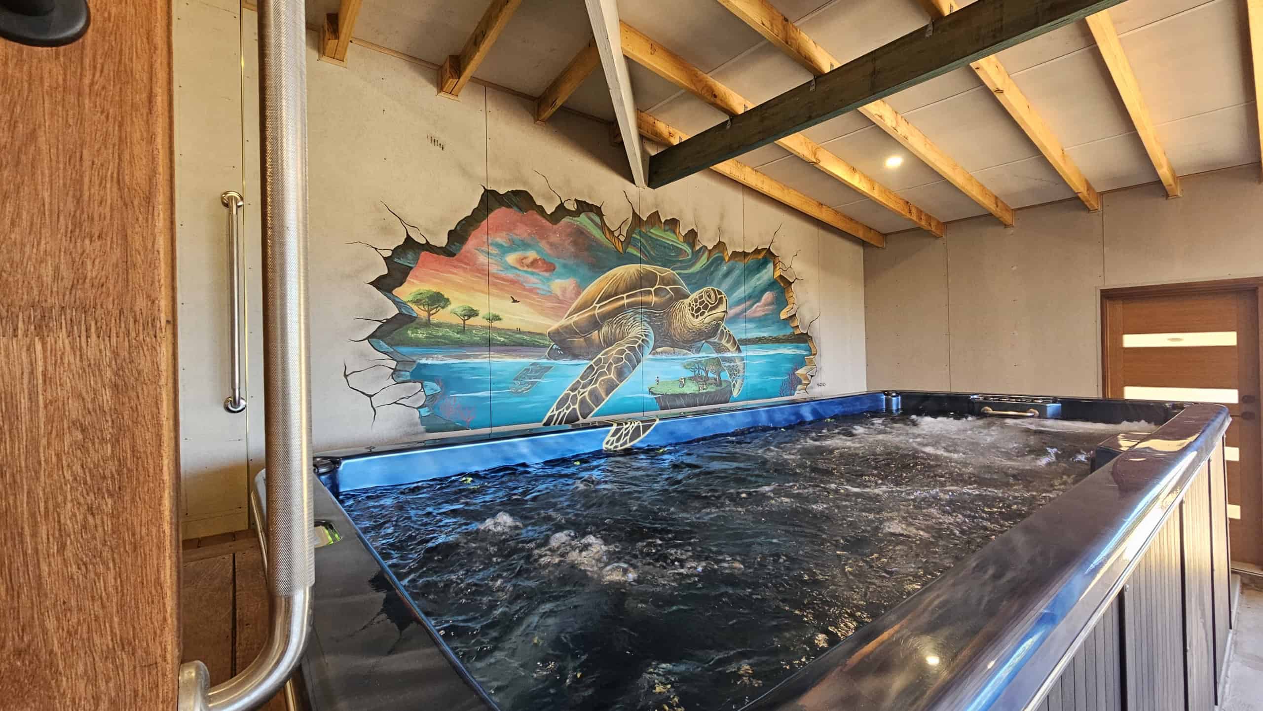 Luxury Additions: swim spa with cover, designer kitchens with high-end appliances, art murals to both sides of the house and on the wall with the spa