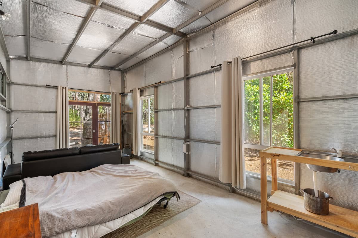 There is no mains water here, and you won’t miss it. A 90,000-litre rainwater tank services the house, while bore water feeds the toilet, garden reticulation and bore pump. A 12-panel, 4.6 kW solar array generates clean electricity, solar hot water is backed by a wood heater plumbed into the hot water system, and energy costs stay remarkably low. It is the kind of infrastructure that quietly pays for itself, season after season.